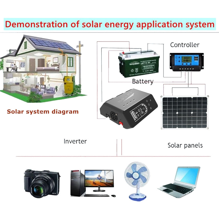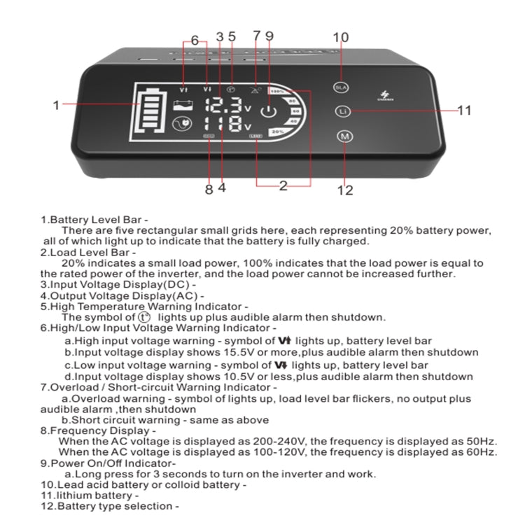 6. Digital display: input/output voltage/battery power/load ratio/frequency, high and low voltage protection, etc.
