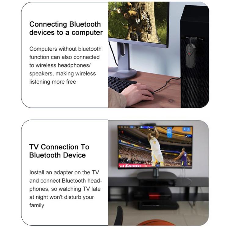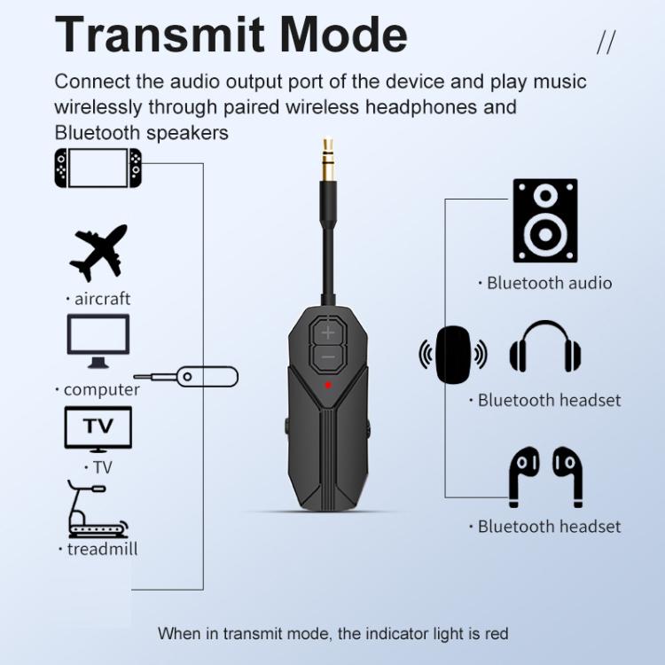 7. Transmitter mode: connect to audio output devices, transmit Bluetooth signals, and play music through paired wireless headphones and Bluetooth speakers
