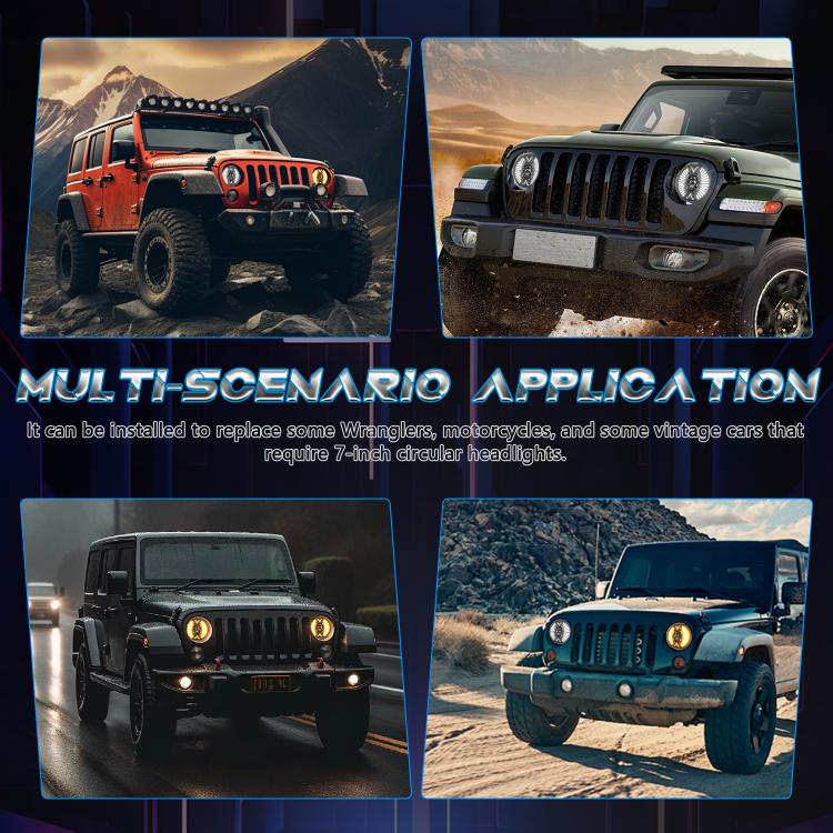 13. 6000K/3500K dual-color 7-inch round LED headlights have 4 lighting modes, high beam (white), low beam (white), daytime running lights (white light), turn signals (yellow light) replace the original halogen lamps to meet various driving needs
