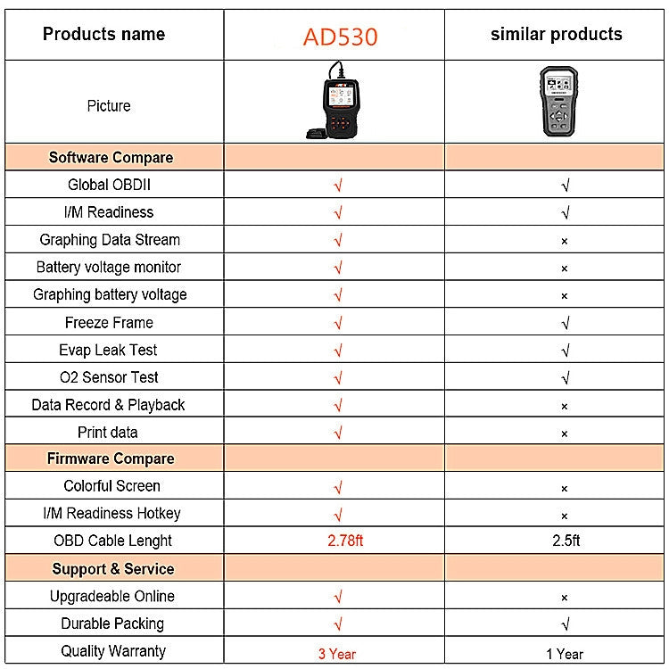 2. AD530 car diagnostic scanner supports turning off the malfunction indicator light (MIL), reading/clearing fault codes and resetting monitors, drawing real-time data flow charts, displaying freeze frame data, testing O2 sensors, EVAP system tests, I/M readiness status (emissions), testing advanced on-board monitoring and retrieving vehicle information (VIN). In addition, this car code reader is equipped with the latest industrial chips, and the scanning speed is 2 times faster than other car code readers.