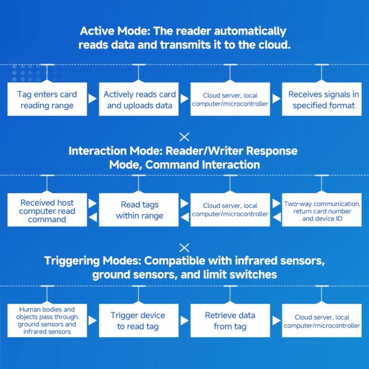 10. Card Reading Modes: Timed automatic reading, external trigger-controlled reading, command-based reading