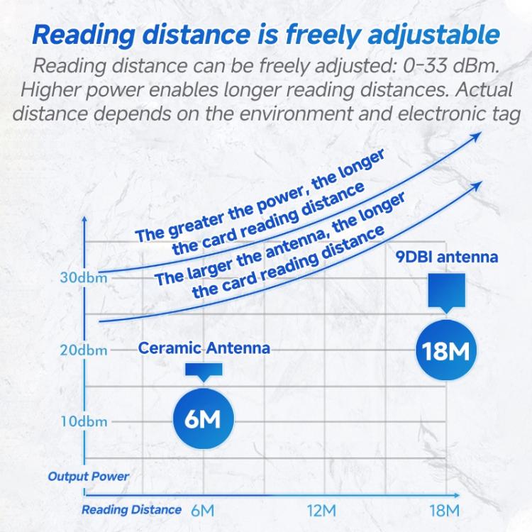 8. Card Reading Distance: Greater than 20 meters, antenna and tag dependent